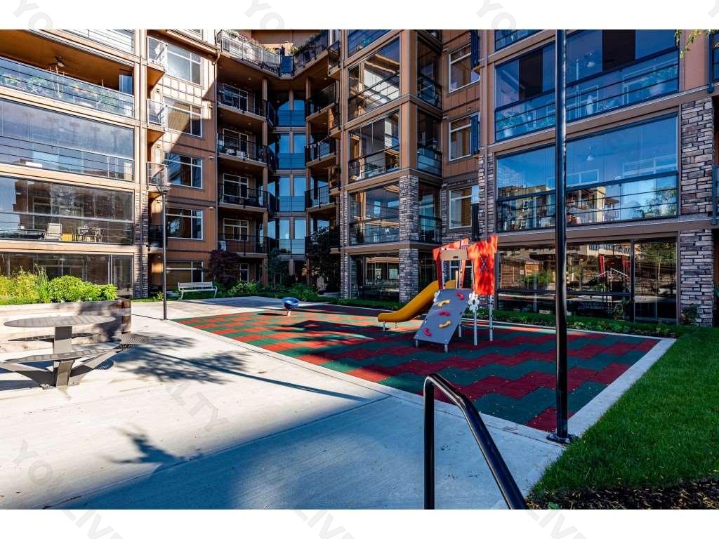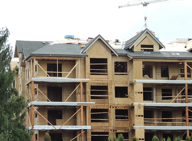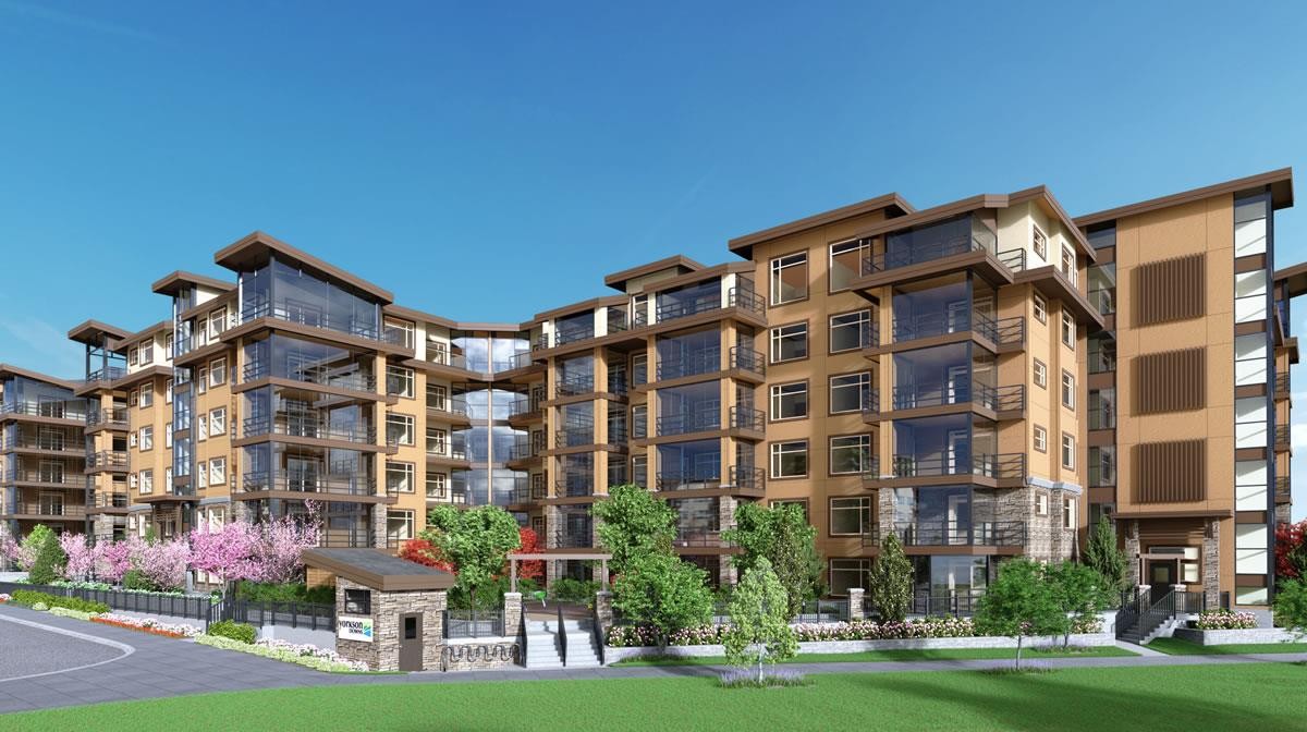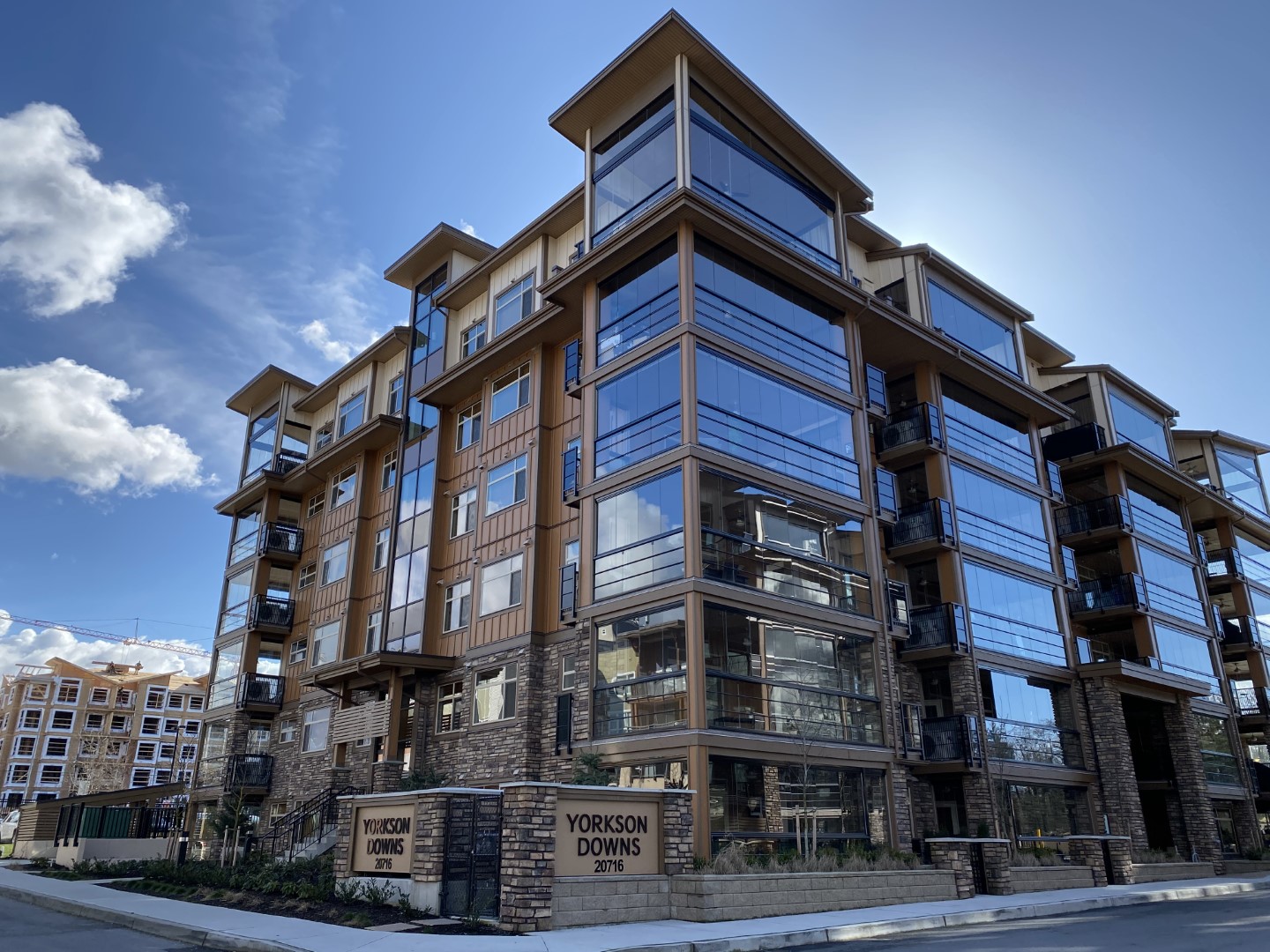 Yorkson Downs features 1 bedroom + den, 2 bedroom + den, 3 bedroom, and 3 bedroom + den floorplans. The floors are a hybrid concrete/wood construction system, and the flooring underside assembly has sound-dampening insulation. Side-by-side suites each have their own separate insulated walls with each side having 2 layers of 5/8” drywall or a layer of wood under drywall. The 6-story building has stunning West Coast architecture featuring extensive use of beams, stone, and glass.